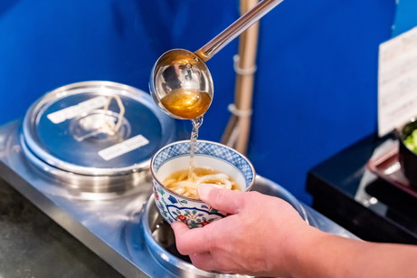 Enjoy authentic Sanuki udon noodles. Buffet breakfast with 30 items to choose from. Fresh noodles are made by a local noodle factory. Dashi broth is made with plenty of dried baby sardines from Ibuki Island. We offer authentic self-service Sanuki Udon.