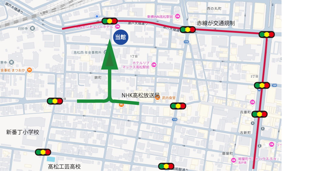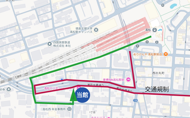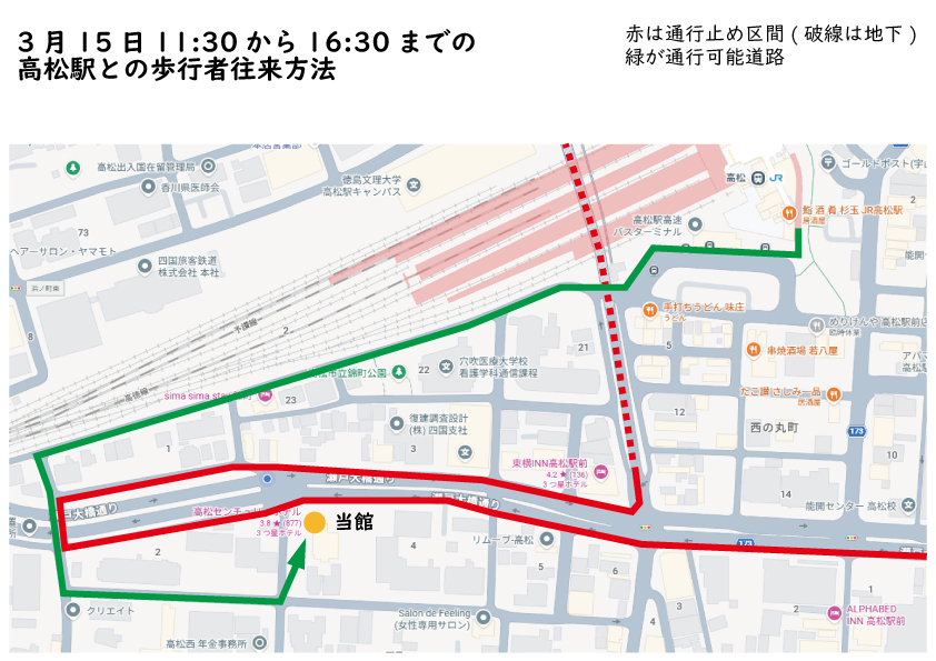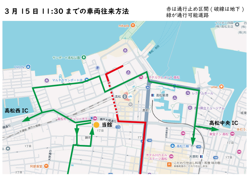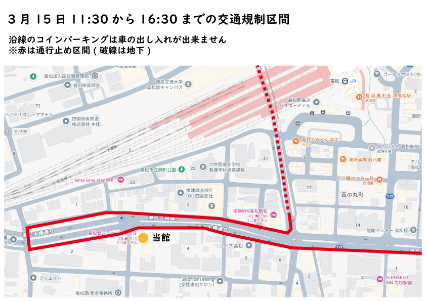 当館北側のさぬき浜街道が11:35から16:30まで交通規制されます。