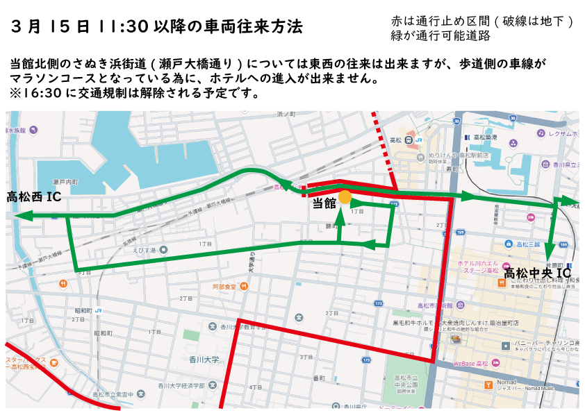特に交通規制につきましてはホテル側では把握ができません、香川マラソン事務局に事前にお問い合わせください。
